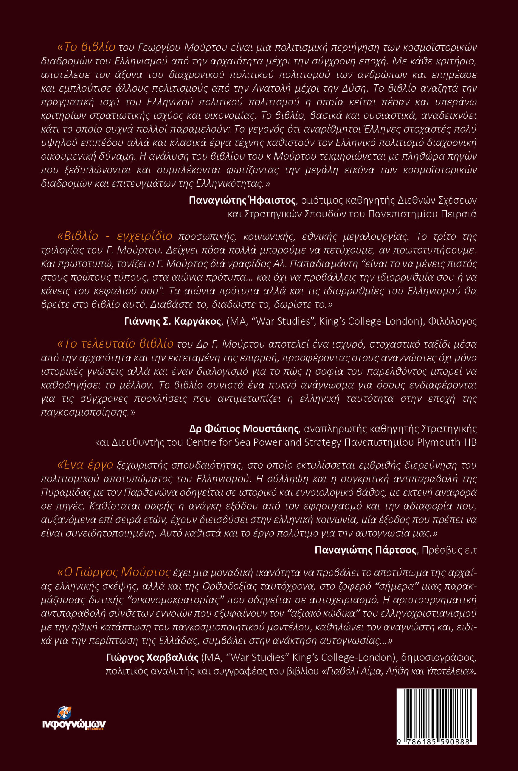 Το νέο βιβλίο του δρ Γεωργίου Μούρτου, Η ΠΥΡΑΜΙΔΑ, Ο ΠΑΡΘΕΝΩΝΑΣ και Η ΑΓΙΑ ΣΟΦΙΑ. Μια γεωπολιτισμική θεώρηση της Ανατολής και της Δύσης, Ο παγκόσμιος Ελληνισμός και η οικουμενική Ορθοδοξία, συμπληρώνει την ενότητα μιας τριλογίας: Οι Αν-ορθόδοξοι της Ορθοδοξίας (2008) και Η Γεωπολιτική της Ελληνικής Γλώσσας (2020). Στο επίκεντρο της ανάλυσης των τριών αυτών συγγραφικών πονημάτων, είναι η οικουμενικότητα του Ελληνισμού και το τεράστιο έλλειμμα στρατηγικής σκέψης που χαρακτηρίζει το ελλαδικό κράτος, με συνέπεια να αδυνατεί να αναγάγει τα μοναδικά συγκριτικά πλεονεκτήματά του σε πολλαπλασιαστές γεωπολιτικής ισχύος.