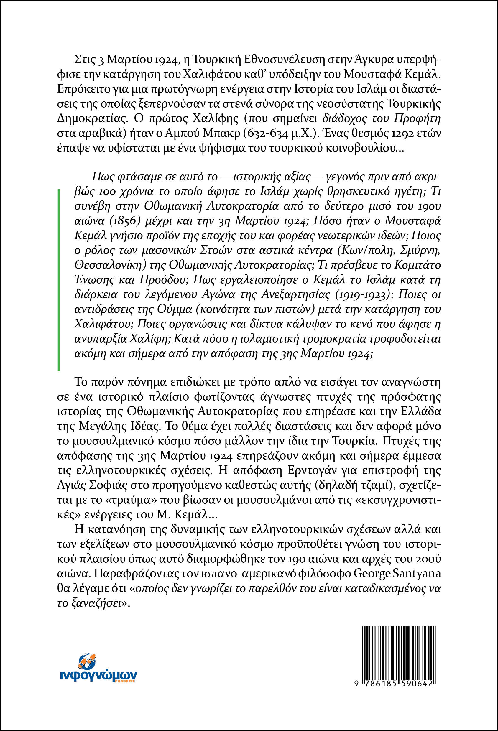 Το παρόν πόνημα επιδιώκει με τρόπο απλό να εισάγει τον αναγνώστη σε ένα ιστορικό πλαίσιο φωτίζοντας άγνωστες πτυχές της πρόσφατης ιστορίας της Οθωμανικής Αυτοκρατορίας που επηρέασε και την Ελλάδα της Μεγάλης Ιδέας. Το θέμα έχει πολλές διαστάσεις και δεν αφορά μόνο το μουσουλμανικό κόσμο πόσο μάλλον την ίδια την Τουρκία. Πτυχές της απόφασης της 3ης Μαρτίου 1924 επηρεάζουν ακόμη και σήμερα έμμεσα τις ελληνοτουρκικές σχέσεις. Η απόφαση Ερντογάν για επιστροφή της Αγιάς Σοφιάς στο προηγούμενο καθεστώς αυτής (δηλαδή τζαμί), σχετίζεται με το «τραύμα» που βίωσαν οι μουσουλμάνοι από τις «εκσυγχρονιστικές» ενέργειες του Μ. Κεμάλ…